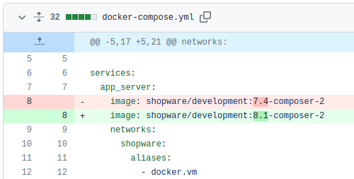 Change the image under services.app_server to shopware/development:8.1-composer-2