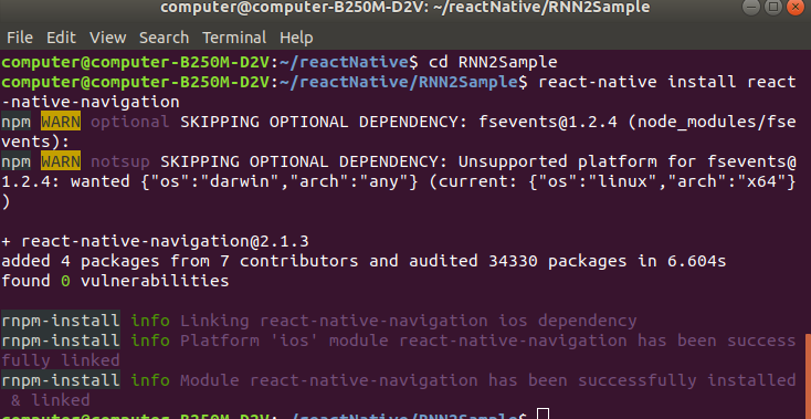 Step 2: cd to the project folder and install react-native-navigation. Refer the below terminal command for that: